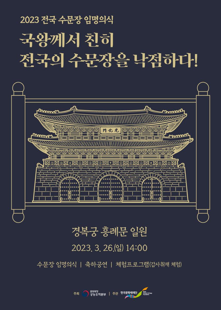 문화재청는 경복궁 흥례문 일원에서 2023년 전국 수문장 임명의식 행사 개최한다.